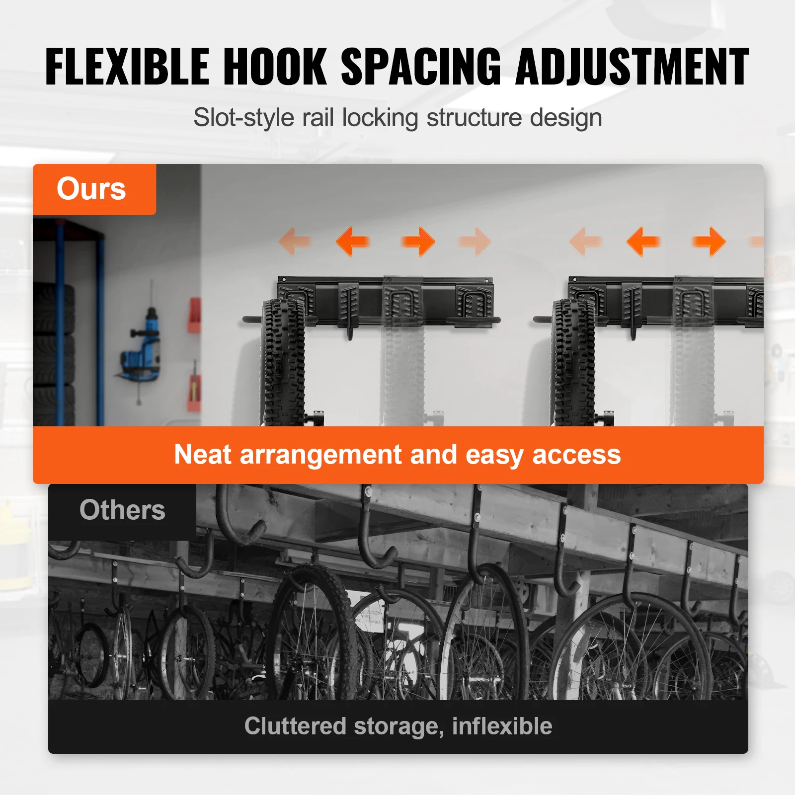 Bicycle Wall Mount Rack is the perfect solution for storing multiple bikes in a compact and organized manner. With its 3/4/5pcs rails design, this rack can accommodate up to 6 bikes, making it ideal for households or garages with multiple cyclists. The fixed hanging hook holder ensures secure storage, while the bike support stand provides stability and easy access to your bikes.