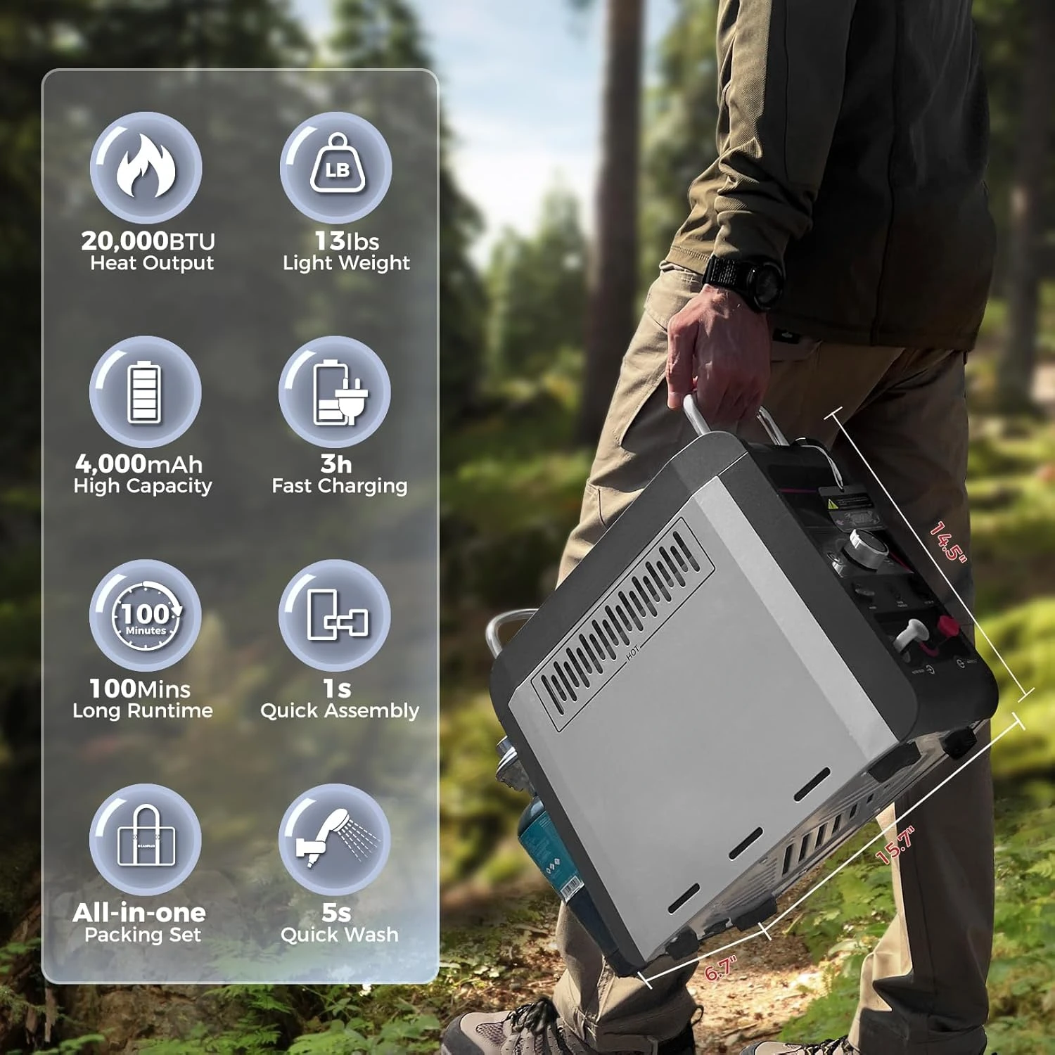 Welcome to Outdoor Equipment Online — making the outdoors safe, fun, and accessible for families with kids. This portable propane camping shower system provides hot water on demand, making it perfect for camping, hiking, and glamping adventures. Designed for convenience, it combines a propane-powered water heater with a rechargeable shower pump, giving you a comfortable and refreshing shower experience wherever you go.